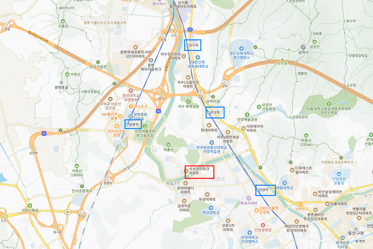 오히려 석수역보다는 1호선 관악역고, ktx 광명역이 더욱 가까운 위치입니다.