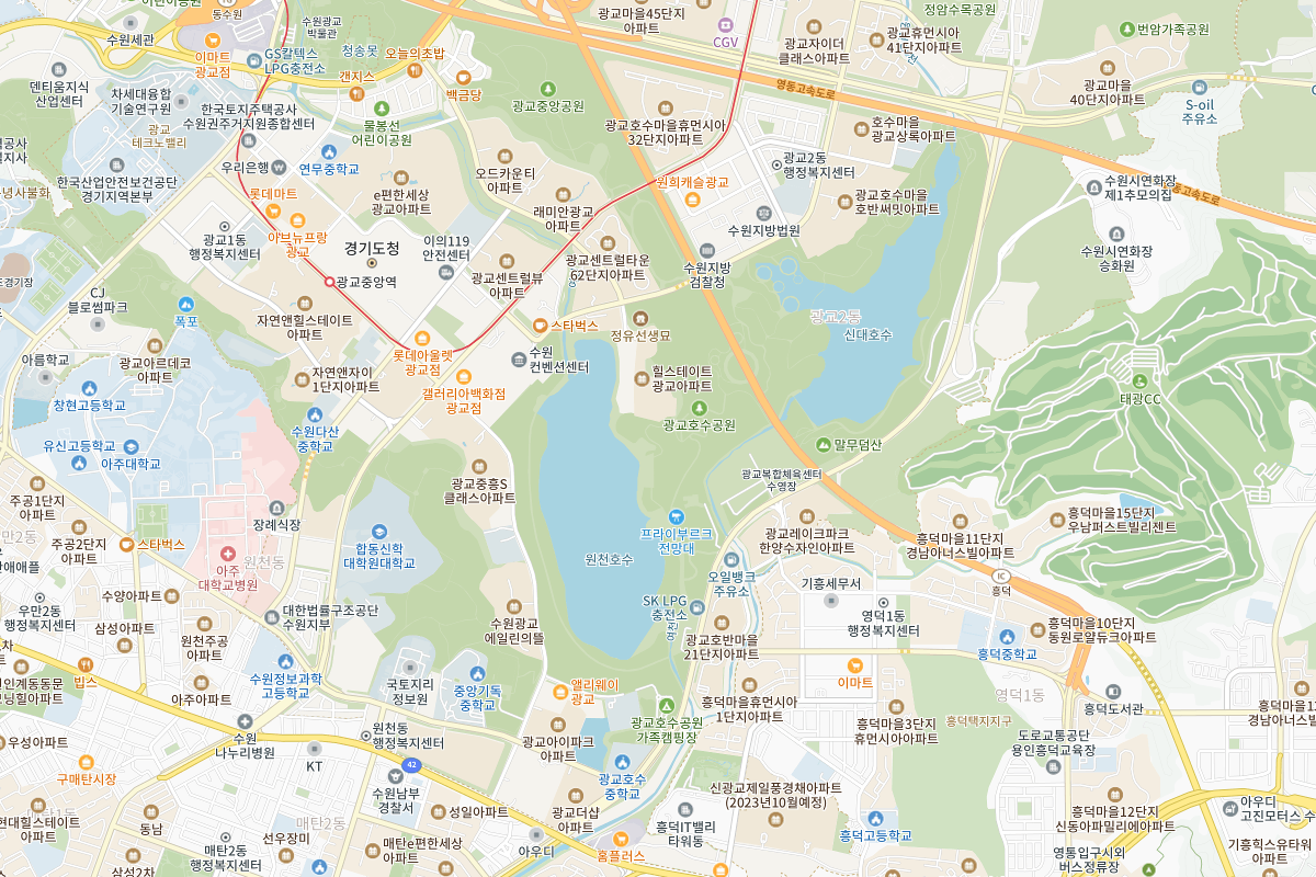 광교신도시는 행정구역은 80% 이상 수원시에 위치하고 있고 나머지는 용인시와 이어져 있습니다.