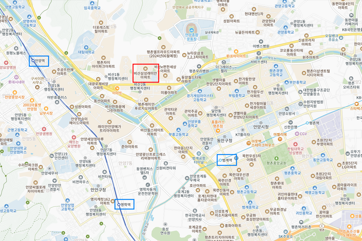 주변에는 비산이편한세상, 비산롯대캐슬아파트, 그리고 2021년 입주한 평촌래미안푸르지오아파트와, 2022년 입주한 평촌자이아이파크 아파트까지, 많은 인구가 밀집하여 살고 있습니다.